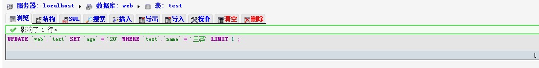 UPDATE `web`.`test` SET `age` = '20' WHERE `test`.`name` = '王莽' LIMIT 1 ;