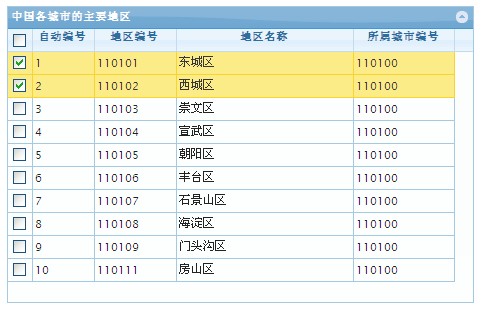 colNames:['自動編號','地區(qū)編號','地區(qū)名稱','所屬城市編號'],