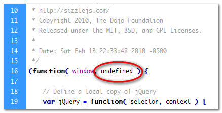 這就是為什么jQuery源碼中最外部的閉包函數(shù)要有個(gè)并沒有傳入的undefined參數(shù),目的就是保護(hù)undefined不要被外部的些不良乘虛而入。
