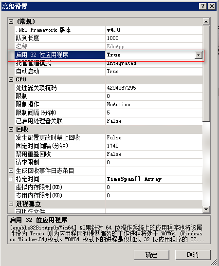 在應(yīng)用程序?qū)τ玫膽?yīng)用程序池的高級設(shè)置中設(shè)置“啟用32位應(yīng)用程序”為“True”