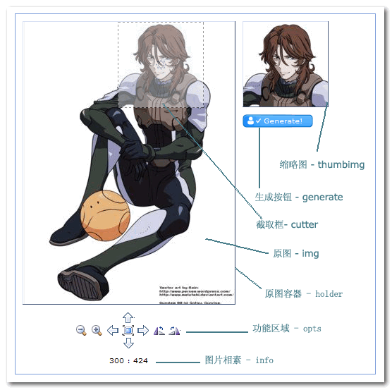 cutter為截取框, 可進行拖拽以選擇自己敢興趣的截取區(qū)域, 拖拽區(qū)域在holder容器內(nèi),  同時會在thumbimg(原理與holder+img相同)內(nèi)生成縮略圖.