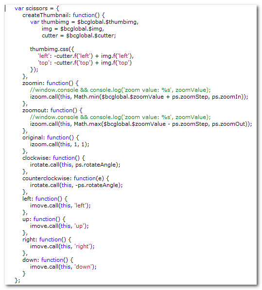 這里我使用了一個對象scissors來封裝這些操作, 使用call來 '繼承', 當(dāng)然你也可以使用 '冒充' 或者 '原型鏈' 這些手段來實現(xiàn). 這樣的話在綁定這些方法的時候使用eval和json就可以很輕松的完成: