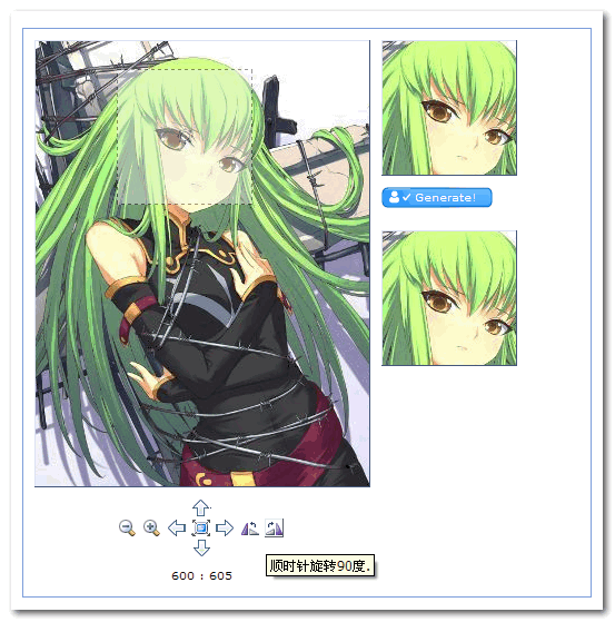 使用一張C.C的圖來截取頭像, 設(shè)置截取框長寬為120:120, 容器為id為container的div, 每次旋轉(zhuǎn)角度為90, 順時針旋轉(zhuǎn)功能按鈕的提示為 '順時針旋轉(zhuǎn){0}度.'