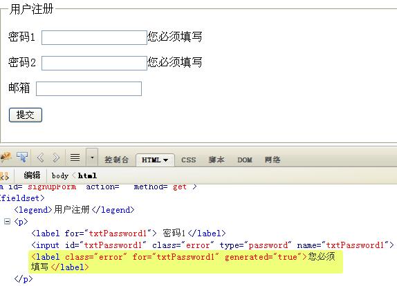 從圖中我們發(fā)現(xiàn)錯誤信息是被放在了一個label標(biāo)簽中,且有一個類樣式error,只要為signupform下面的