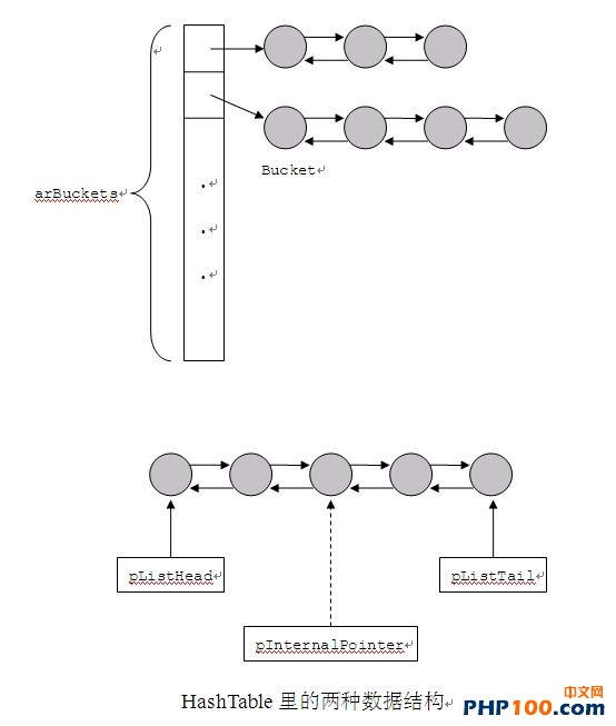 總的來說,Zend的HashTable是一種鏈表散列,同時也為線性遍歷進(jìn)行了優(yōu)化,圖示如下: