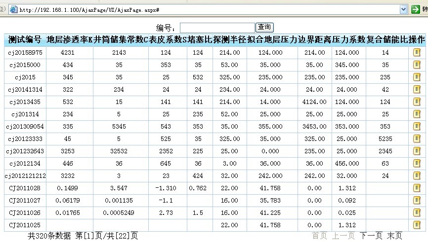 功能簡介:主要功能就是分頁顯示數(shù)據(jù)了,可在配置文件中配置每頁要顯示的頁碼,可以做多條件聯(lián)合查詢,這里只是做一個簡單的查詢。歡迎拍磚,有問題的還望大蝦們斧正哈??纯催@個效果圖,無刷新的噢??!