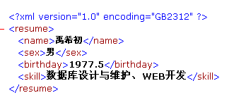 以上均為CSS樣式,建議讀者參考有關(guān)資料熟悉CSS,在以后學習中必須用到,此處由于篇幅關(guān)系不作介紹。建立文件resume.css后,在個人簡歷.xml文件的第一行后添加以下文字: