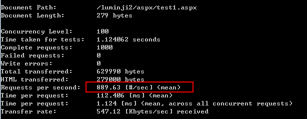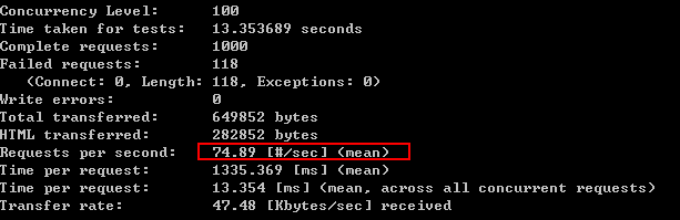 對該頁面進(jìn)行壓力測試,100個(gè)用戶,1000個(gè)請求,得到的結(jié)果如下: