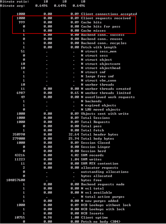 可以使用varnishstat命令,對varnish進(jìn)行監(jiān)控,在上面的壓力測試中,如果我們使用監(jiān)控,得到的結(jié)果如下: