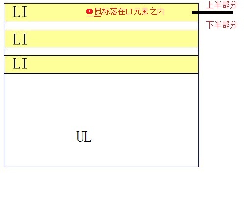 判斷插入點就是判斷當(dāng)前鼠標(biāo)所在的坐標(biāo),如果鼠標(biāo)坐標(biāo)落在除了元素A之外的其他LI元素范圍之內(nèi),就滿足可插入的條件,同時上半部分就插入到前面,下半部分就插入到后面。(=。= 個人口味重,覺得這段話好邪惡?。?