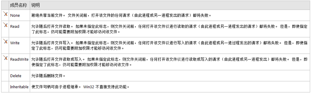 MSDN上的解釋是指定操作系統(tǒng)打開文件的方式,我想這個應(yīng)該不需要解釋了,大家平時用得比較多了。MSDN的表格也很好的闡述了各個枚舉值的作用,我就不在解釋了。
