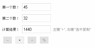 <input type="text" size="10" name="jieguo" onClick="imyeah(0)" value="+" onfocus="this.select()" /> <span>左鍵"+",右鍵"選中復(fù)制"</span>