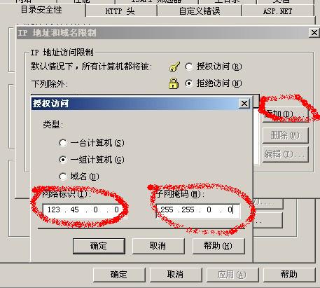 還有一種情況,就是我們大部分站長用的都是動態(tài)IP,這種情況怎么應(yīng)對呢,看圖,把原來的一臺換成一組,然后輸入123.45.0.0,后面輸入255.255.0.0然后確定就可以啦,一般ADSL動態(tài)IP的變換不會有幾個段的,把你經(jīng)常用的IP段都加進去就OK了!