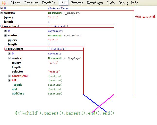 在pushStack內(nèi)部, 把els.get()返回的DOM數(shù)組封裝成一個(gè)新的jQuery對(duì)象, 而this(jQuery[div#child])會(huì)賦值給之前新構(gòu)建jQuery的prevObject, 最后返回新生的那個(gè)jQuery對(duì)象.