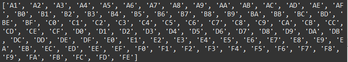 然后去除B0-D7這樣的小節(jié)編碼,同時(shí)提取字符編碼的時(shí)候也要用到類(lèi)似的A1-FE這樣的編碼,于是就想生成這樣一個(gè)list,方便做刪除和索引操作。
