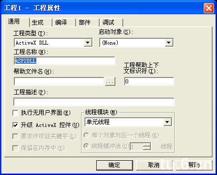 工程重命名:工程-->工程1 屬性(此名稱對應(yīng)窗體內(nèi)工程項(xiàng)目名稱)-->在打開對話框中將“工程名稱”重命名為ASP2DLL(當(dāng)DLL組件在系統(tǒng)中注冊后,在asp中默認(rèn)的調(diào)用方法是“工程名.類名”)-->確定