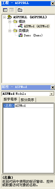 重命名模塊:工程資源管理器-->模塊--Module1-->在屬性窗口中將Module1重命名為“ASPMod”