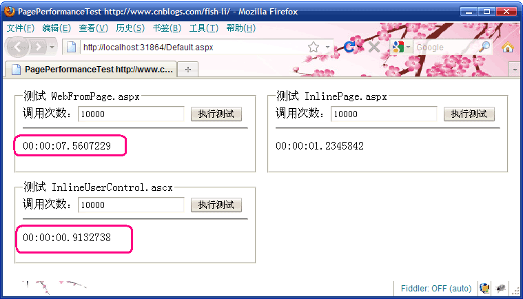 因?yàn)閺腍ttpWebRequest發(fā)起調(diào)用到獲取結(jié)果,這其中除了有頁(yè)面的執(zhí)行時(shí)間,還混雜較多的額外調(diào)用開銷。最終,我選擇了在一次HTTP請(qǐng)求中,循環(huán)調(diào)用Server.Execute來(lái)執(zhí)行頁(yè)面,并統(tǒng)計(jì)時(shí)間的方式。其實(shí)如何選擇測(cè)試方法,對(duì)于二個(gè)測(cè)試對(duì)象還說(shuō),都是公平的。只是說(shuō):盡量減少一些額外的調(diào)用開銷,會(huì)讓測(cè)試結(jié)果的差異更大,也更明顯。