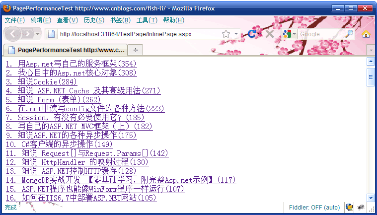這個(gè)頁(yè)面其實(shí)就是顯示了一堆超鏈接,它們來(lái)自于我的博客側(cè)邊欄的【推薦排行榜】,總共有20條記錄,我讓頁(yè)面重復(fù)5次輸出,也就是生成了100個(gè)超鏈接。