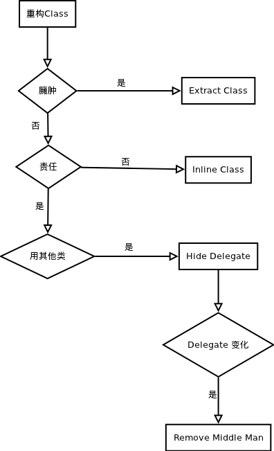 需要注意一下,“Extract Class”和“Inline Class”,”Hide Delegate“和”Remove Middle Man",都是相反的過程,具體理解,可以看前言中的那張流程圖。