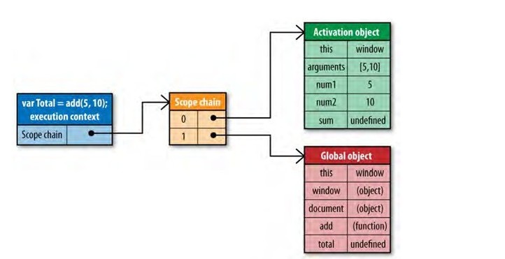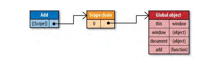 當(dāng)執(zhí)行 add 函數(shù)的時(shí)候, JavaScript 會(huì)創(chuàng)建一個(gè) Execute context (執(zhí)行上下文),執(zhí)行上下文中就包含了 add 函數(shù)運(yùn)行期所需要的所有信息。 Execute context 也有自己的 Scope chain, 當(dāng)函數(shù)運(yùn)行時(shí), JavaScript 引擎會(huì)首先從用 add 函數(shù)的作用域鏈來(lái)初始化執(zhí)行上下文的作用域鏈。