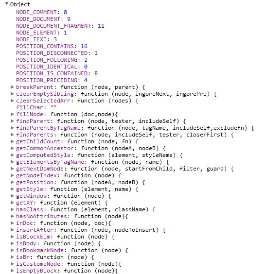當我們console.log(domUtils)的時候,可以在控制臺中,看見很多domUtils下的方法,這些方法都是用于操作節(jié)點的,findParentByTagName()顧名思義,獲取的是節(jié)點,當我們的光標在編輯器內容處,而我們要獲取相應內容外層節(jié)點的id以及各種屬性,就需要通過domUtils來獲得不同幀內的節(jié)點。