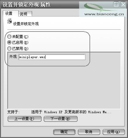 Windows Media Player是目前最流行的多媒體播放器之一,如果不希望其他用戶隨意更改其界面外觀的話,利用組策略可以輕松實(shí)現(xiàn)。打開“組策略控制臺→用戶配置→管理模板→Windows 組件→Windows Media Player→用戶界面中的設(shè)置并鎖定外觀”啟用此策略。