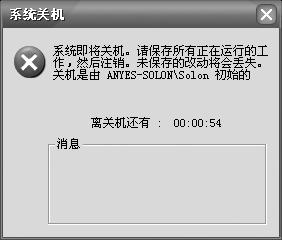 這時(shí),在Anyes-solon計(jì)算機(jī)的屏幕上將顯示一個(gè)“系統(tǒng)關(guān)機(jī)”的對話框,在對話框下方還有一個(gè)計(jì)時(shí)器,顯示離關(guān)機(jī)還有多少時(shí)間(如圖12所示)。在等待關(guān)機(jī)的時(shí)間里,用戶還可以執(zhí)行其他的任務(wù),如關(guān)閉程序、打開文件等,但無法關(guān)閉該對話框,除非你用shutdown -a命令來中止關(guān)機(jī)任務(wù)。
