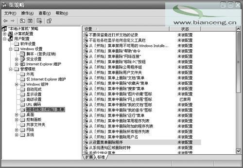 如果覺得Windows的“開始”菜單太臃腫的話,可以將不需要的菜單項從“開始”菜單中刪除。在組策略右側窗格中,提供了“從開始菜單刪除用戶文件夾”、“刪除到‘Windows Update'的訪問和鏈接”、“從開始菜單刪除公用程序組”、“從開始菜單中刪除‘我的文檔'圖標”等多種組策略配置項目。你只要將不需要的菜單項所對應的策略啟用即可。