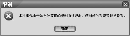 如果你不想隨意讓他人更改“任務欄”和“開始”菜單的設置,你只要將組策略控制臺右側窗格中的“阻止更改‘任務欄和開始菜單'設置”和“阻止訪問任務欄的上下文菜單”兩個策略項啟用即可。這樣,當你用鼠標右鍵單擊任務欄并單擊“屬性”時,系統(tǒng)會出現(xiàn)一個錯誤消息(圖7),且當鼠標右鍵單擊任務欄及任務欄上的項目時,例如“開始”按鈕、時鐘和“任務欄”按鈕,彈出菜單會隱藏。