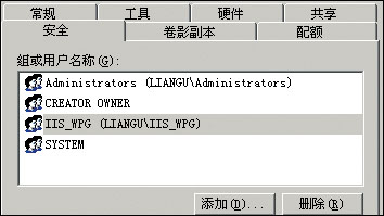 第一步是有別于Windows 2000設(shè)置的關(guān)鍵:右擊C盤,點擊“共享與安全”,在出現(xiàn)在對話框中選擇“安全”選項卡,將Everyone、Users組刪除,刪除后如果你的網(wǎng)站連ASP程序都不能運行,請?zhí)砑覫IS_WPG組(圖1),并重啟計算機。