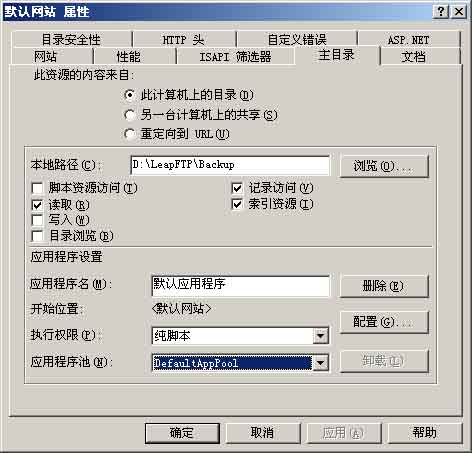 完成了上面的設置后,再展開IIS6.0控制臺窗口中的“網(wǎng)站”項目,并用鼠標右擊目標網(wǎng)站的名稱,再執(zhí)行右鍵菜單中的“屬性”命令,然后在彈出的網(wǎng)站屬性窗口中單擊“主目錄”標簽,并檢查圖2標簽頁面中的應用程序池是否被設置成了“DefaultAppPool”,如果不是的話必須將它調(diào)整過來。倘若服務器中還存在其他網(wǎng)站的話,我們再按相同的設置方法,將其他網(wǎng)站的應用程序池也設置為“DefaultAppPool”,最后單擊“確定”按鈕,這樣就能實現(xiàn)阻止網(wǎng)站耗費太多內(nèi)存資源的目的了。