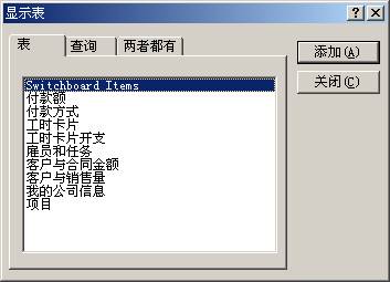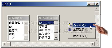 如果需要添加的關(guān)系表沒有在“關(guān)系”對話框中列出,那么就需要進(jìn)入“顯示表”對話框,為此可以右擊“關(guān)系”對話框中任意處,然后從一份快捷菜單中選擇“顯示表”命令,參圖41。接下來就可以在這個(gè)對話框的“表”選項(xiàng)卡中選擇要加入的表,然后單擊“添加”按鈕。下面的操作將使用“雇員和任務(wù)”、“客戶與銷售量”、“客戶與合同金額”這三張數(shù)據(jù)表,它們?nèi)际窃诖酥敖⒌?,所輸入的?shù)據(jù)記錄也很簡單,各字段如圖42所示,您可以自己建立好。