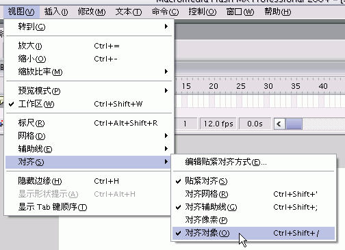 1、運(yùn)行Flash mx 2004,新建一空白文檔(500*240)。在菜單上選擇視圖--對(duì)齊--對(duì)齊對(duì)象(如圖示)。