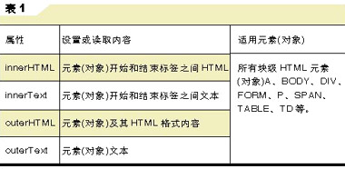 HTML塊級元素(對象)提供的4個可讀寫屬性innerHTML、innerText、 outerHTML、outerText來更改元素(對象)內(nèi)容(如表1所示)。
