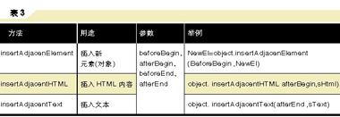 插入網(wǎng)頁新元素(對象)、HTML或文本內(nèi)容 此外,也可用insertAdjacenElement、insertAdjacentHTML和insertAdjacentText等方法分別在元素(對象)的指定位置插入新元素(對象)、Html或文本內(nèi)容(如表3所示)。