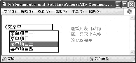 頁面的<STYLE>部分定義了三個樣式,分別用于菜單條、菜單項目、選擇列表,通過樣式定義保證菜單、選擇列表的顯示區(qū)域重疊。<BODY>部分包含菜單和<SELECT>選擇列表的定義。當(dāng)鼠標(biāo)經(jīng)過菜單條時,JavaScript函數(shù)showMenu執(zhí)行,顯示出菜單,同時隱藏SELECT選擇列表。鼠標(biāo)離開后,hideMnu函數(shù)隱藏菜單,同時恢復(fù)選擇列表。其余幾個JavaScript函數(shù)主要用于模擬菜單動作,鼠標(biāo)經(jīng)過菜單項時以高亮度顯示菜單(setStyle函數(shù)),鼠標(biāo)離開菜單項目時則將它恢復(fù)默認(rèn)顯示形式(setDefault函數(shù))。頁面的運行效果如圖二所示。將showMenu函數(shù)中的document.getElementById("lb_1").style.visibility="hidden"語句注釋掉就可以看到圖一的效果。