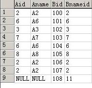 有SQL基本知識的人都知道,兩個表要做連接,就必須有個連接字段,從上表中的數(shù)據(jù)可以看出,在A表中的Aid和B表中的Bnameid就是兩個連接字段。
