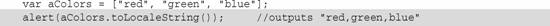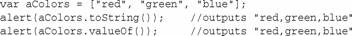 Array對象覆蓋了toString()方法和valueOf()方法,返回特殊的字符串。該字符串是通過對每項調(diào)用toString()方法,然后用逗號把它們連接在一起構(gòu)成的。例如,對具有項"red"、"green"和"blue"的數(shù)組調(diào)用toString()方法或valueOf()方法,返回的是字符串"red,green,blue"。