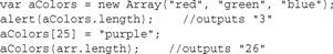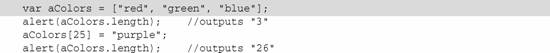 在這段代碼中,下一個未使用的位置是3,所以值"purple"將被賦予它。增加一項使數(shù)組的大小從3變成了4。但如果把值放在這個數(shù)組的位置25處會怎樣呢?ECMAScript將把從3開始到24的所有位置都填上值null,然后在位置25處放上正確的值,并把數(shù)組大小增大為26: