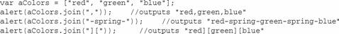 這里用方法join()創(chuàng)建了三種不同的數(shù)組表示。第一個join()方法使用逗號,本質(zhì)上與調(diào)用toString()方法或valueOf()方法等價。第二個和第三個join()方法使用不同的字符串,在數(shù)組項之間創(chuàng)建了奇怪的分隔符(可能不怎么有用)。理解的重點在于任何字符串都可以用作分隔符。