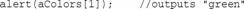 與字符串類似,數(shù)組中的第一個項位于位置0,第二個項位于位置1,依此類推??赏ㄟ^使用方括號中放置要讀取的項的位置來訪問特定的項。例如,要用剛才定義的數(shù)組輸出字符串"green",可以采用下面的代碼: