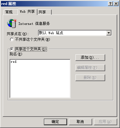 4,當(dāng)然很重要的就是對(duì)red文件夾進(jìn)行虛擬目錄的設(shè)定。方法是在red文件夾上右鍵鼠標(biāo),選擇“共享...”,彈出窗口中繼續(xù)選擇“Web共享”標(biāo)簽,選擇“共享這個(gè)文件夾”,別名設(shè)為“red”。最后“確定”。