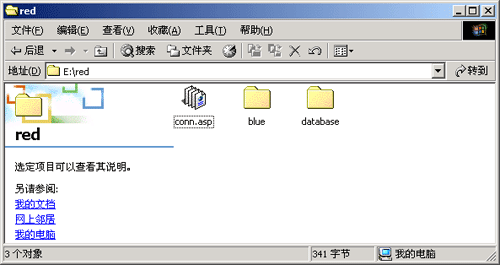 3,為了進(jìn)行比較對(duì)照,繼續(xù)在red文件夾下面建立blue文件夾,該夾子內(nèi)部存放同樣的conn.asp文件