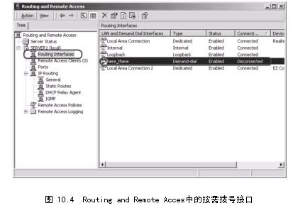 此外,還需要證實LocaISA Server VPN Configuration向?qū)б呀?jīng)在Routing and Remote Access中創(chuàng)建了適當(dāng)?shù)恼埱髶芴柦涌凇?稍赗outing Interfaces節(jié)點對此進行檢查,如圖 10.4所示。