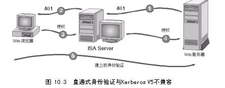 例如,陣列的默認身份驗證模式是集成的Windows身份驗證。但此方法不能驗證運行非Windows操作系統(tǒng)的客戶機。如果要在ISA Server中為此類客戶提供驗證的訪問服務(wù),則必須把陣列屬性配置為使用其他的身份驗證方法。同樣,集成的Windows身份驗證與Netscape也不兼容,因為Netscape不能傳遞NTLM格式的用戶證書。它的另一個限制是依靠Kerberos V5身份驗證協(xié)議或它自己的質(zhì)詢/響應(yīng)身份驗證協(xié)議,然而在直通式身份驗證方案中,如圖 10.3所示,ISA Server不支持Kerberos V5身份驗證協(xié)議,因為Kerberos V5要求客戶機能識別驗證身份的服務(wù)器。