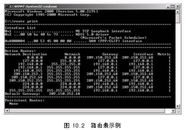 Route 命令行工具可以用來來查看和修改路由表。在命令行中輸入route print,就會顯示本地路由表。如圖 10.2所示。