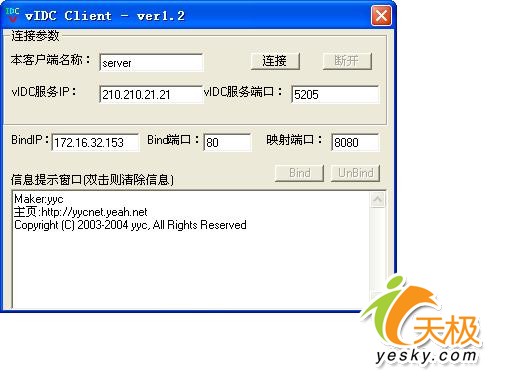 解釋一下上面的設(shè)置: VIDC服務(wù)IP,指運(yùn)行了vidcs.exe進(jìn)行監(jiān)聽了端口的IP地址,端口指是在公網(wǎng)上監(jiān)聽的端口,上面我監(jiān)聽的是5205端口,bindip指你要開放出去的內(nèi)網(wǎng)的IP, Bind端口指你內(nèi)網(wǎng)計(jì)算機(jī)需要開放的端口(FTP服務(wù)器端口為21, WEB 服務(wù)端口為80, mail服務(wù)端口25)你想開放哪個(gè)就填哪個(gè)吧。