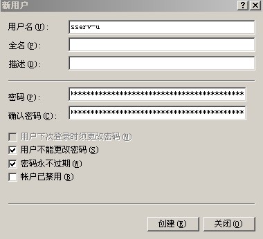下面就到了該對SERV-U進行安全設(shè)置的時候了。首先建立一個WINDOWS賬號SSERVU,密碼也需要足夠的復雜。密碼要記住,如果記不住就暫時保存在一個文件里,一會兒還要用到。(見圖8)