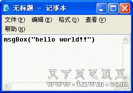 下面我們來編寫一個(gè)經(jīng)典的例程:hello world。我們要實(shí)現(xiàn)的就是如圖1中的效果,要實(shí)現(xiàn)這一效果其實(shí)只須一條語句就行。具體做法如下:打開記事本,在編輯區(qū)輸入“msgBox(“hello world”)”(如圖2),然后以VBS為擴(kuò)展名保存文件(“保存類型”里面選擇“所有文件”,在“文件名”里面輸入包括擴(kuò)展名的文件名,如“hello world.vbs”),保存完成后直接雙擊保存的文件,效果就出來了。學(xué)過VB的朋友都知道m(xù)sgbox函數(shù)是VB編程中最常用的函數(shù)之一,它可以實(shí)現(xiàn)彈出窗口提示信息。